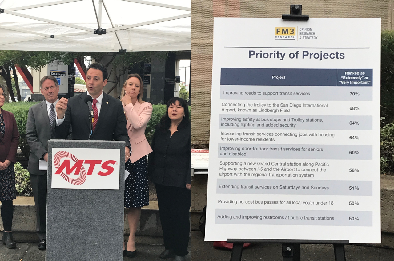According to a recent poll conducted by FM3 Research, public support is very strong to fund more transit projects with a possible new half-cent sales tax. Transportation officials from the Metropolitan Transit System (MTS) and the San Diego Association of Governments (SANDAG) made the announcement on Wednesday, releasing details on the poll results and adding that this is the first step in a broad public dialogue the agency will embark on over the next nine months.