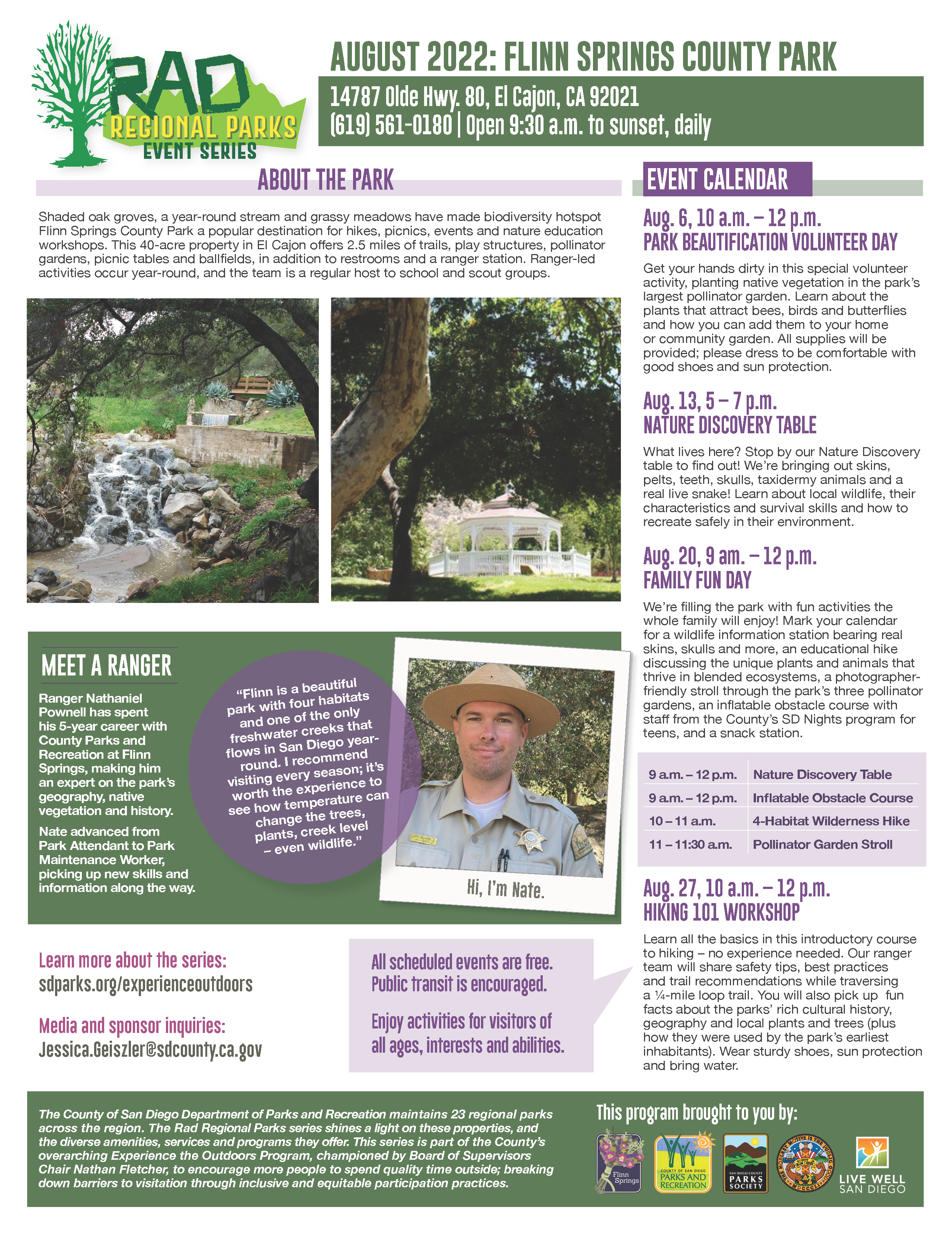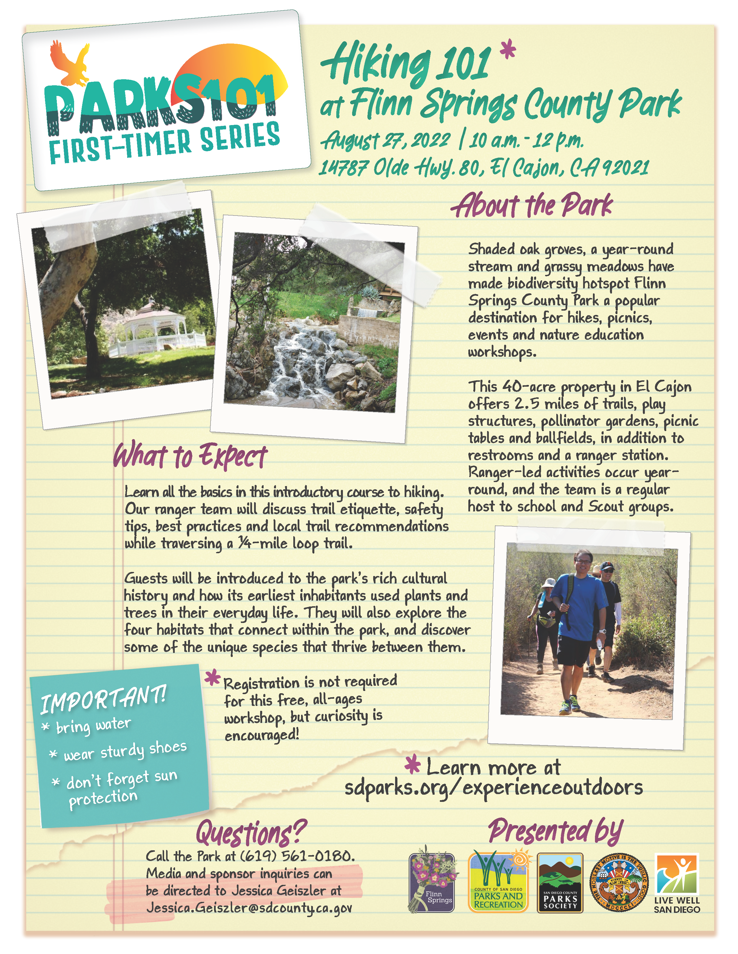 “Our diverse County parks not only preserve our natural environment but encourage people from across the region to enjoy the outdoors,” said Brian Albright, Director of the County of San Diego Department of Parks and Recreation. “Experience the Outdoors will bring more people than ever before into our parks.”